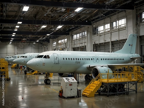 Aircraft manufacturing facility with a focus on the aerospace production line and equipment.