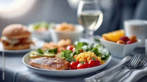 meal, airline, tray, salmon, salad, aeroplane, food, dining, travel, beverage, glasses, cutlery, fork, knife, plate, tomatoes, greener, cucumber, fruit, hamburger, pasta, serving, table, interior, cabin, window, light, presentation, catering, service, epicure, healthy, cookery, inflight