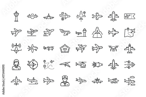 "Airplane and Aviation Line Icons Set – Vector Flight, Airport, and Pilot Symbols"