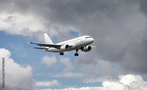 Airplane approaching at the airport, with cloudy background