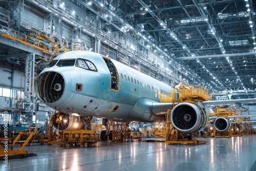 aeroplane, assembly, factory, aviation, manufacturing, industry, aerospace, engineering, construction, aircraft, transport, technology, production, work, facility, building, engine, wing, fuselage, labor, men at work, machinery, equipment, structure, interior, overhead, light, industrial, modern, large, scale, project, process, progress, development, complex, detailed, precision, craftsmanship, innovation, future, transportation, commercial, mechanic, tool, support, staging
