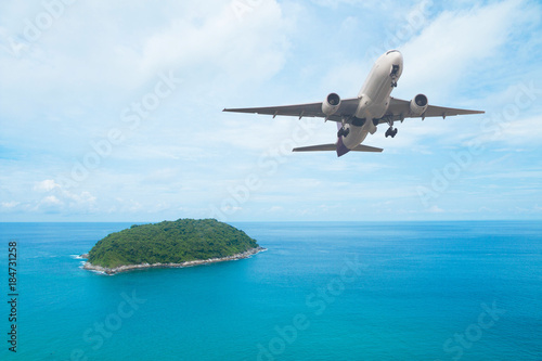 Airplane flying above sea island