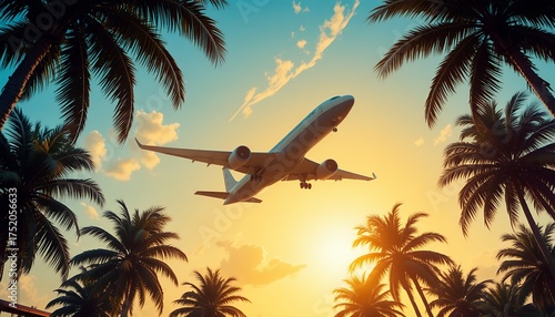 airplane flying above tropical palm trees during golden sunset with vibrant sky hues