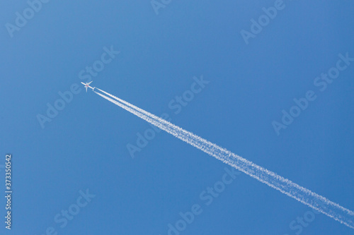 aeroplane, sky, plane, jet, blue, aircraft, air, aeroplane, travel, fly, flight, flying, white, trace, condensation trail, transportation, transport, aviation, high, cloud, clear, condensation, line, clear sky, blue skies, sunny, go, copy space, blank space, simple, future, departure, moving, new life, refresh, reservation, move, fast, speed, tomorrow, positive, overcome, change, challenge