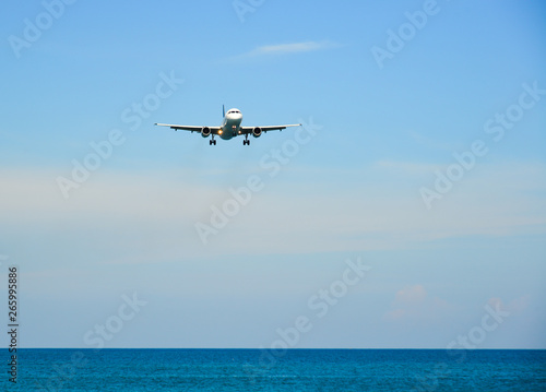 Airplane landing over the sand beach