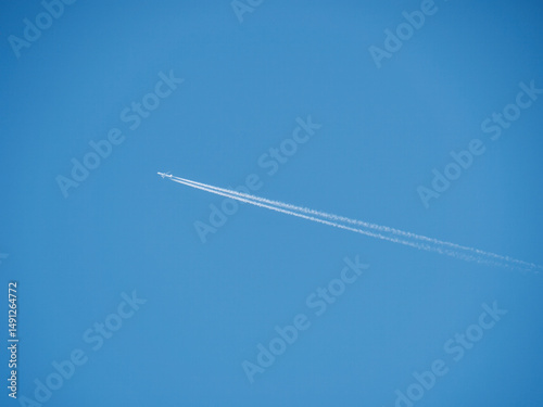 aerial, air, aircraft, aeroplane, altitude, atmosphere, aviation, blue, civil, clear, cloud, colours, condensation trail, distance, environmental, flight, flying, high, horizon, impact, industry, jet, journey, modern, nature, photo, plane, science, sky, technology, tour tourism, traffic, trail, transportation, travel, view