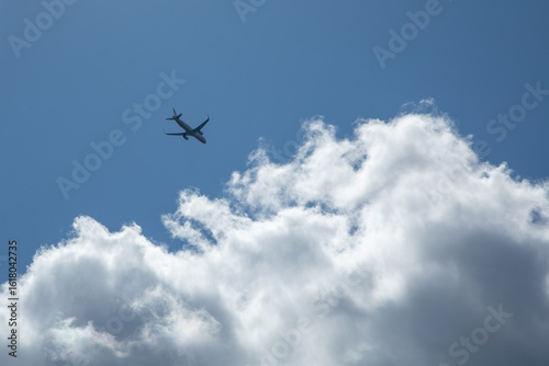 aeroplane, aircraft, silhouette, blue, sky, cloud, white, fluffy, puffy, flying, flight, aviation, commercial, passenger, travel, journey, freedom, peaceful, serene, beautiful, atmosphere, weather, cloudy, daytime, nature, transportation, airline, jet, airliner, airborne, altitude, high, up high, through, scenic, picturesque, dreamy, soft, light, bright, contrast, shadow, dark, small, distant, civil, public, transport