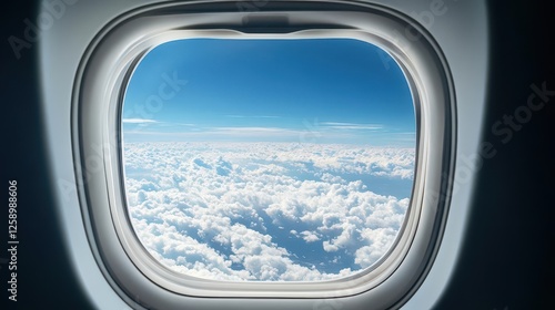 Airplane Window View of Dramatic Cloud Formations and Blue Sky