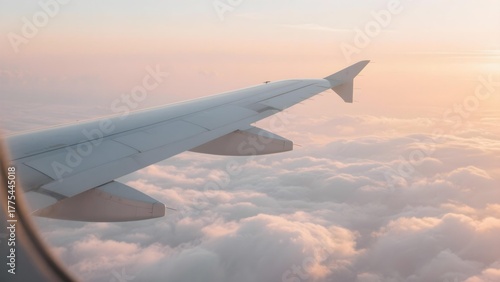 Airplane wing view above clouds at sunset ideal for travel themes