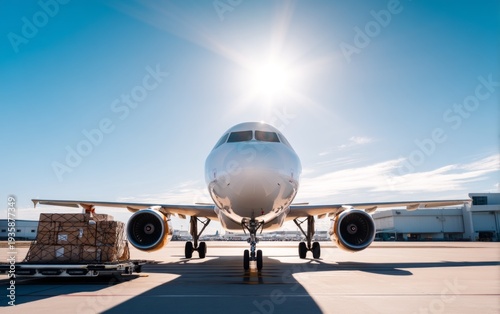 Airplane with Cargo on Tarmac in Bright Sunlight and Clear Blue Sky