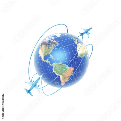 aeroplane, globe, earth, flight, travel, journey, blue, white, earth, map, transportation, air, sky, route, global, international, aviation, tour tourism, passenger, cargo, aerodrome, pilot, cabin, wing, tail, landing, take-off, altitude, speed, distance, navigation, horizon, cloud, weather, destination, direction, three-dimensional, rendering, illustration