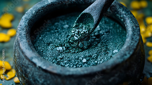 Alchemy in Focus: An ancient stone mortar and pestle cradles a vibrant, deep turquoise powder, hinting at age-old potions, and mysterious concoctions