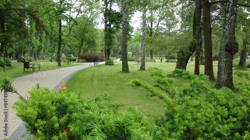 hem, spring, alley, garden, pathway, sidewalk, bench, green, tree, christmas tree, birch, leafy, bush, relax, health resort, poland, polish, grass, spa, urban, rest, springtime, summer