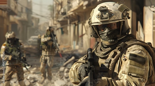 commando, military, tactical, gear, weaponry, alert, vigilant, navigate, debris, dilapidated, metropolis, documentary, muted, colours, palette, setting, three-dimensional, rendered, generative, soldier, combat, uniform, armoring, munition