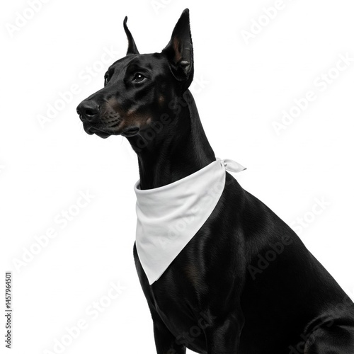doberman, dog, pet, canino, black, proud, intelligent, expressive, powerful, muscular, purebred, glossy, strong, friendly, collar, posing, companion, stylish, security, smart, mammal, shiny, obedient, sleek, fashionable, elegant, attentive, noble, loyal, ear, protective, guard, watchful, breed, alert, family, isolated, domestic, portrait, bandana, white, animal, accessory, background, beautiful
