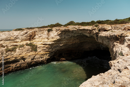 Algarve coastal cliff with large sea cave over turquoise waters, Portugal