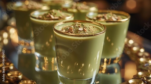 Almond Milk and Matcha Shots Small shot glasses filled with chilled matcha almond milk, garnished with gold-dusted almond flakes.