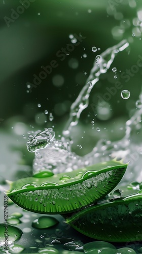 Aloe vera leaf with water droplets splashing into clear water, natural setting for wellness and spa
