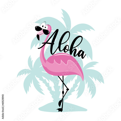 Aloha - hawaiian greeting with funny flamingo in sunglasses. Good for T shirt print, poster, card, label, and other decoration.