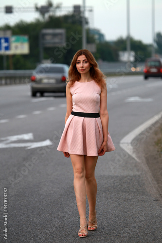 town, person, people, urban, happy, model, looking, confident, space, empty, highway, asphalt, journey, adventure, background, tour tourism, transportation, travel, young, beautiful, trip, car, vacation, standing, walk, fashion, beauty, female, jacket, girl, city, street, transport, dividing, country, wait, hitchhike, line, hitchhike, signs, expectation, hope, jean, woman, alone, road, traffic