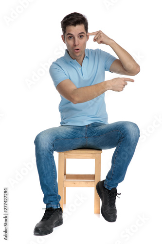 man, young, guy, hold, hand, photogenic, attractive, smart, casual attire, fashion, dramatic, sexy, elegant, cool, modern, look, portrait, pose, hair, style, happy, smile, studio, background, white, polo, blue, shirt, t-shirt, jean, to sit, seated, chair, stool, caucasian, people, person, isolated, pointing, finger, show, choose, choice, side, presenting, recommend, forehead, amazed, astonished