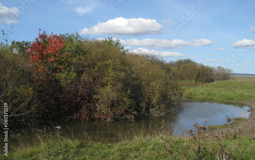 Amazing autumn landscape: turn of a small river and colorful leaves of bushes.