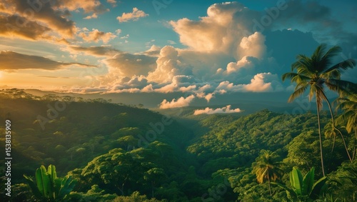 Amazon Rainforest at Dawn with Lush Greenery and Thick Clouds, Space for Text