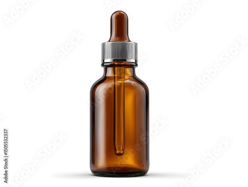 Amber glass dropper bottle with a sleek metallic cap, ideal for essential oils, cosmetic serums, beauty products, and medical tinctures, isolated on a clean white background