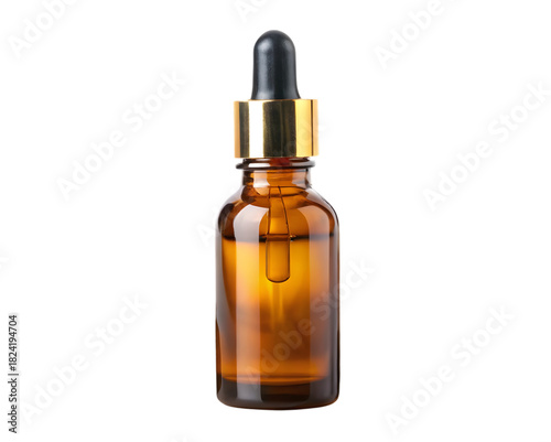 Amber glass dropper bottle with golden cap isolated on transparent background