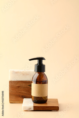 Amber glass pump bottle dispenser with shampoo on wooden and stone podium on beige background.