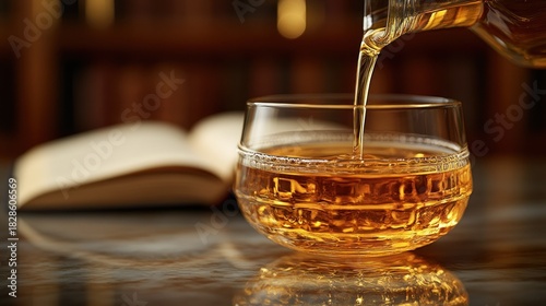 liquid, pour, glasses, bowl, amber, tea, drink, gold, warm, smooth, flowing, pouring, serving, table, book, vintage, elegant, luxury, still, life, close, up, detail, light, golden brown, rich, smoothness, texture, delicate, fine, glassware, brew, antique, gentle, cosy, warmth, refined, dark, background, bookshelf