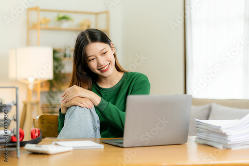Ambitious Asian girl working from home Looking at laptop screen and smiling, checking mail or doing research while working remotely, online startup business, telemarketing