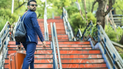 Ambitious young professional in a blue suit carrying a backpack and orange suitcase, walking up outdoor stairs, symbolizing career growth and modern business travel.