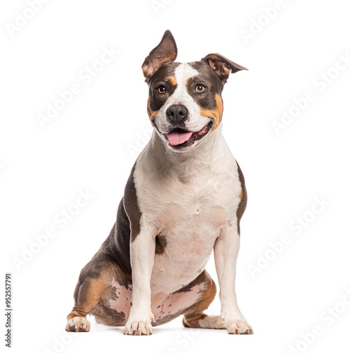 American staffordshire terrier sitting on a white background, Panting its tongue out and lokking away up
