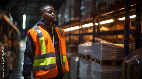 Amid the organized chaos of a warehouse, a black African worker donning a high visibility vest stands poised. The shelves stacked with merchandise serve as a backdrop