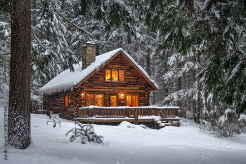 Amidst a wintry wonderland, a charming log cabin with glowing windows stands surrounded by towering snow-draped evergreens, offering an inviting retreat.