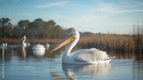 Amidst the serene delta environment on a sunny, clear day, a pelican swims with grace in calm waters, flanked by fellow pelicans