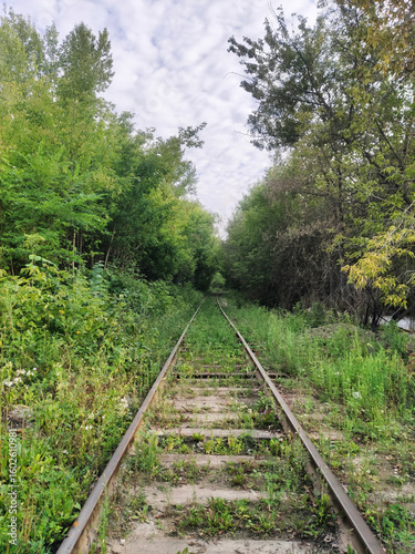 An abandoned rail road leading into a dense forest. A mystical photo with a cloudy sky and a dark road. Old tram tracks in the city limits, overgrown with wild plants and forest.