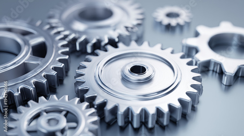 An abstract composition of interlocking bronze gears against a gradient blue background.