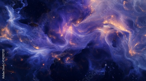 An abstract cosmic scene with swirling, deep blue and purple nebulae that have gold metallic foil veins going through them to give the illusion of a marbled texture. The background is filled with star