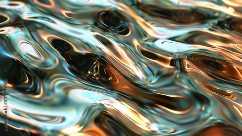 An abstract depiction of liquid with swirling patterns in shades of copper and turquoise, reflecting light and creating an engaging visual texture for artistic applications.