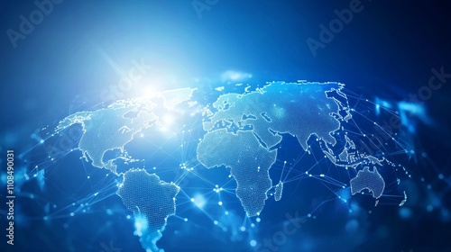 An abstract digital world map featuring intricate global network connections, with a glowing globe at the center on a vibrant blue background, symbolizing the essence of international business