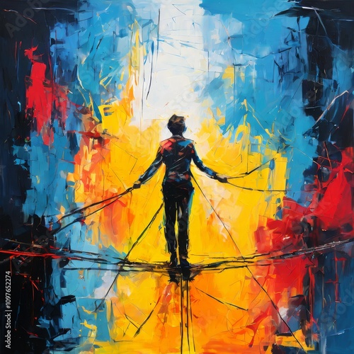 abstract, figure, tightrope, vibrant, colours, balance, risk, sharpened, dramatic, colourful, painting, energetic, high-coloured, art, artistic, expression, dynamic, modern, bright, contrast, walking, tension, metaphor, expressionism, ai, generation