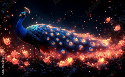 peacock, vibrant, colourful, foliage, abstract, landscape, nature, bird, tropical, wildlife, serene, lush, green, blue, design, pattern, environment, whimsical, flora, beauty, bright, illustration, creative, elegance, fauna, garden, imaginative, captivating, visual, harmony, art, paradise, detailed, tranquil, decorative, plant, scenery