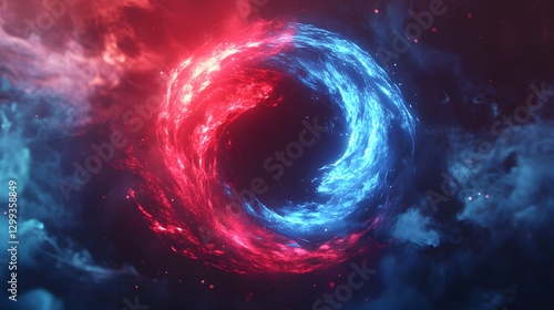 An abstract logo of red and blue light waves colliding in the center with futuristic elements and background
