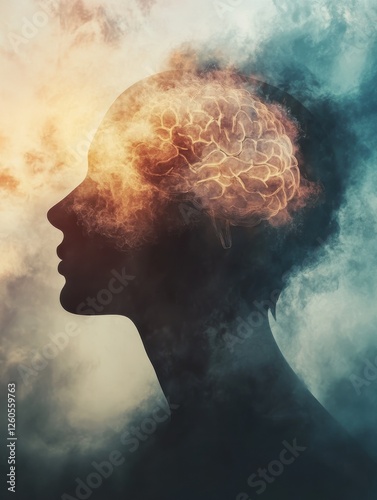 an abstract representation of brain fog depicting human head silhouette with clouded or obscured brain symbolizing difficulty in thinking concentration and mental clarity