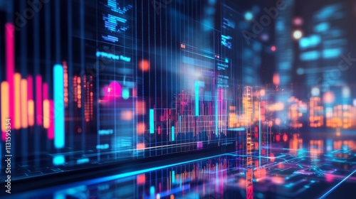 An abstract scene featuring a futuristic city with glowing holograms displaying business analytics, focusing on advanced technologies