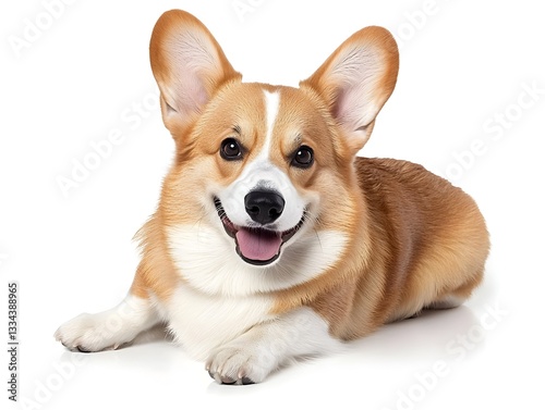 An adorable Pembroke Welsh Corgi dog lies down on a white background smiling happily for a perfect pet portrait photograph.