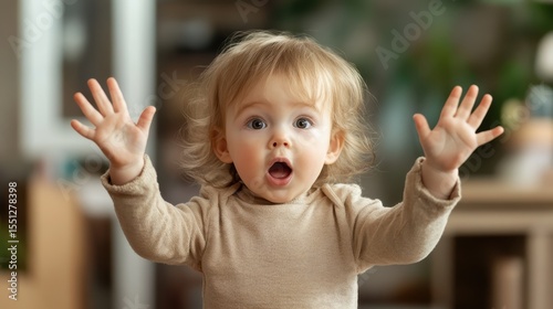 An adorable toddler with curly hair joyfully raises their arms in excitement, capturing the essence of childhood innocence and the purest form of happiness and wonder.