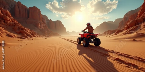 An adventurous quad rider navigates the stunning desert landscape at sunset, embodying the spirit of the Dakar Rally.